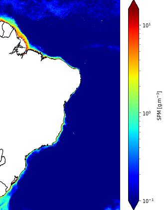 The MODIS-Aqua monthly Suspended Particulate Matter concentration (SPM, measured in g·m-3) utilizes daily data from the MODIS sensor onboard NASA's Aqua satellite (MODIS-Aqua). This data has a nominal resolution of 1 km at nadir and is atmospherically corrected through the application of the Ocean Color - Simultaneous Marine and Aerosol Retrieval Tool (OC-SMART) (FAN et al., 2021). The SPM estimates are obtained from a blend of two SPM algorithms (Salah Salah et al., 2025). Subsequently, the SPM products are aggregated into monthly averages by calculating the geometric mean of daily SPM data over the respective month.